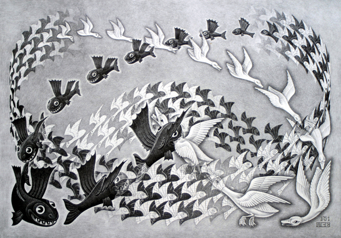 Escher’s body of work consists of 448 woodcuts, wood engravings, lithographs, mezzotints, and linocuts.  Woodcuts are images carved into sidegrain wood, whereas wood engravings are cut into endgrain wood.  The endgrain allows for greater detail.  The carved wood is then inked and paper is pressed onto the inked surface thereby transferring the image to the paper. Learn more about his TECHNIQUES here.